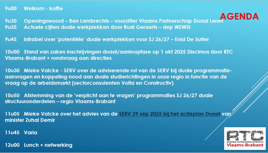 Op 7 november 2025, vond het Provinciaal Overlegforum Duaal Leren Vlaams-Brabant plaats in Leuven. Als voorzitter mocht RTC Vlaams-Brabant ruim 40 deelnemers uit scholen, sectoren en partners verwelkomen voor een constructieve en erg interactieve voormiddag.